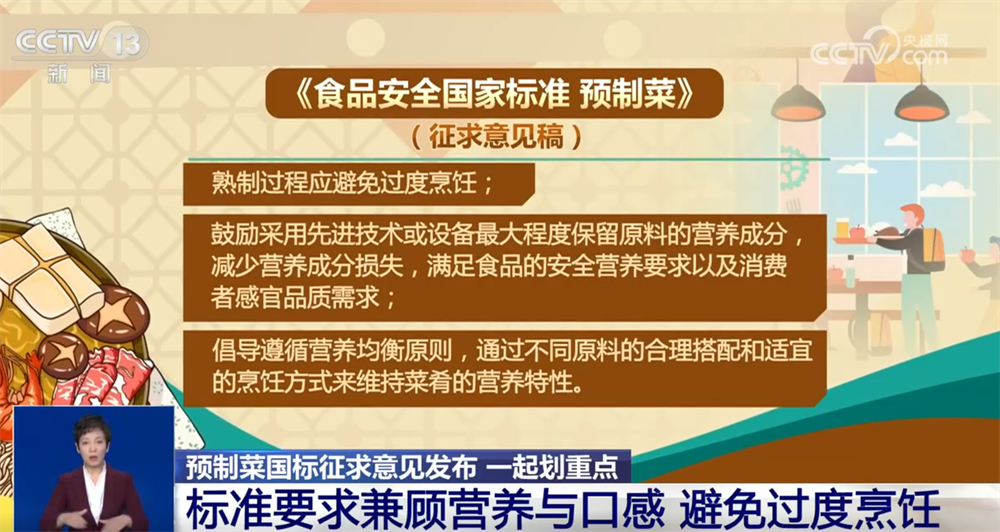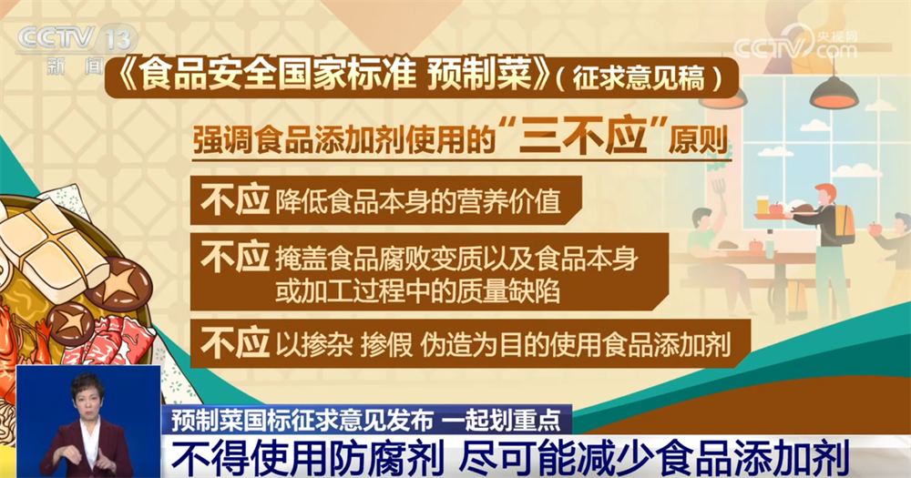 国家食品安全风险评估中心标准二室主任 王君:在此基础上,为引导食品企业通过改进工艺技术保障预制菜产品的安全与营养品质,从技术源头减少对食品添加剂的依赖,标准要求除不得添加防腐剂外,还要尽可能减少食品添加剂的使用,严控了允许使用的食品添加剂品种,将可使用的食品添加剂种类缩小至国家标准规定的、可在各类食品中“按生产要适量使用”的添加剂品种。