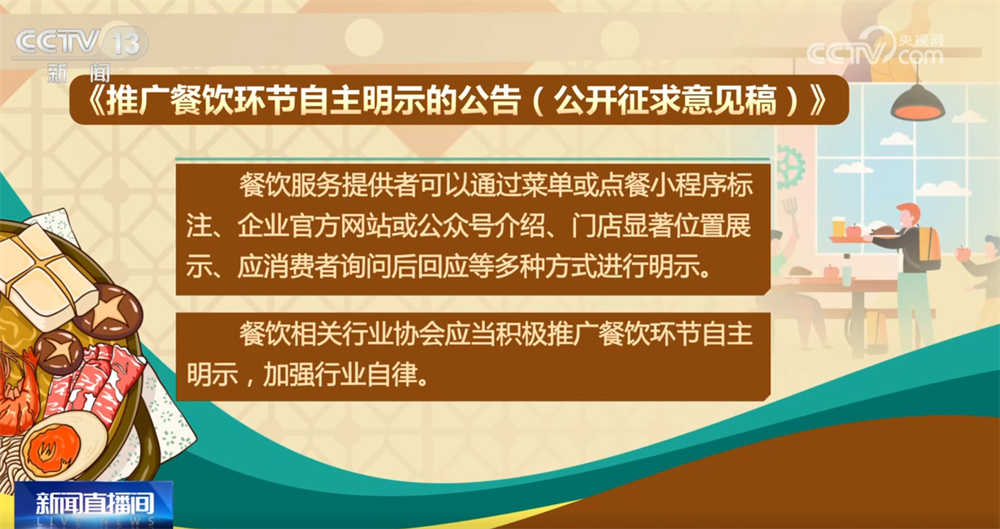 《推广餐饮环节自主明示的公告(公开征求意见稿)》明确,餐饮服务提供者应当依法诚信经营,接受社会监督,承担社会责任,采取必要措施保障消费者知情权和选择权。