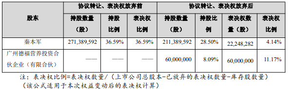 2025年12月22日,公司控制股权的人、实际控制人秦本军与广州德福营养签署了《控制权变更框架协议》《股份转让协议》《表决权放弃协议》,约定秦本军向广州德福营养协议转让其所持上市公司6,000万股股份(占公司总股本比例为8.09%),放弃189,141,310股股份表决权(占公司总股本比例为25.50%),保留22,248,282股股份表决权(占公司总股本比例为3.00%)。