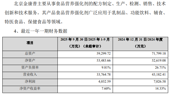 2024年度、2025年前三季度,标的公司北京金康普营业收入分别为43,182.41万元、33,764.78万元,净利润分别为7,026.58万元、4,032.59万元,净资产收益率分别为14.33%、7.60%。
